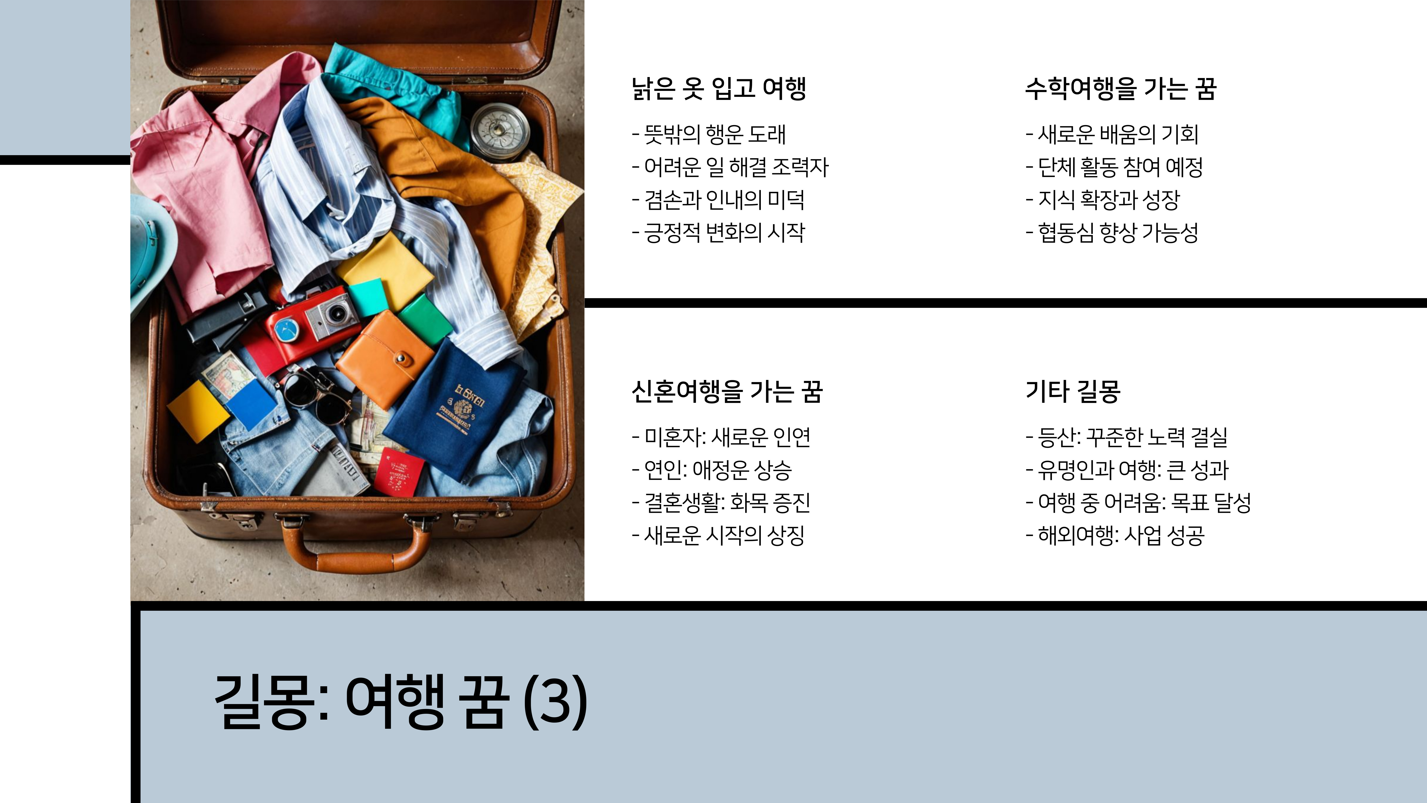 이번 포스팅에서는 여행과 관련된 다양한 꿈의 의미를 상황별로 자세히 알아보고, 길몽과 흉몽의 차이를 분석해 보겠습니다.